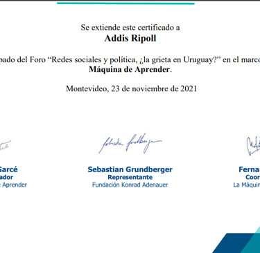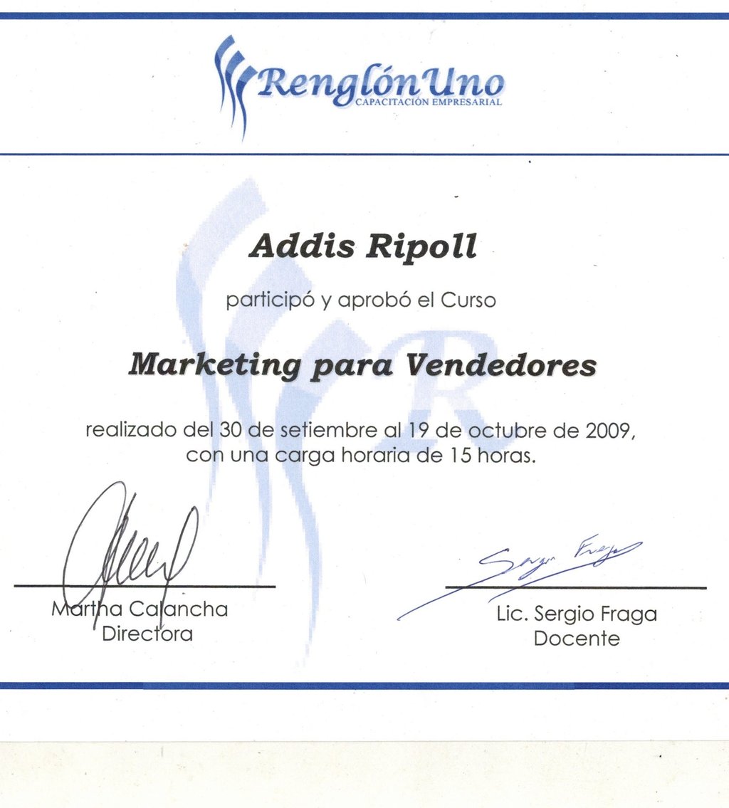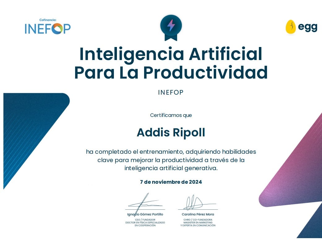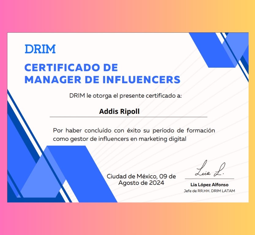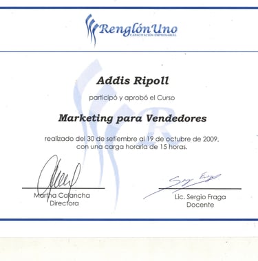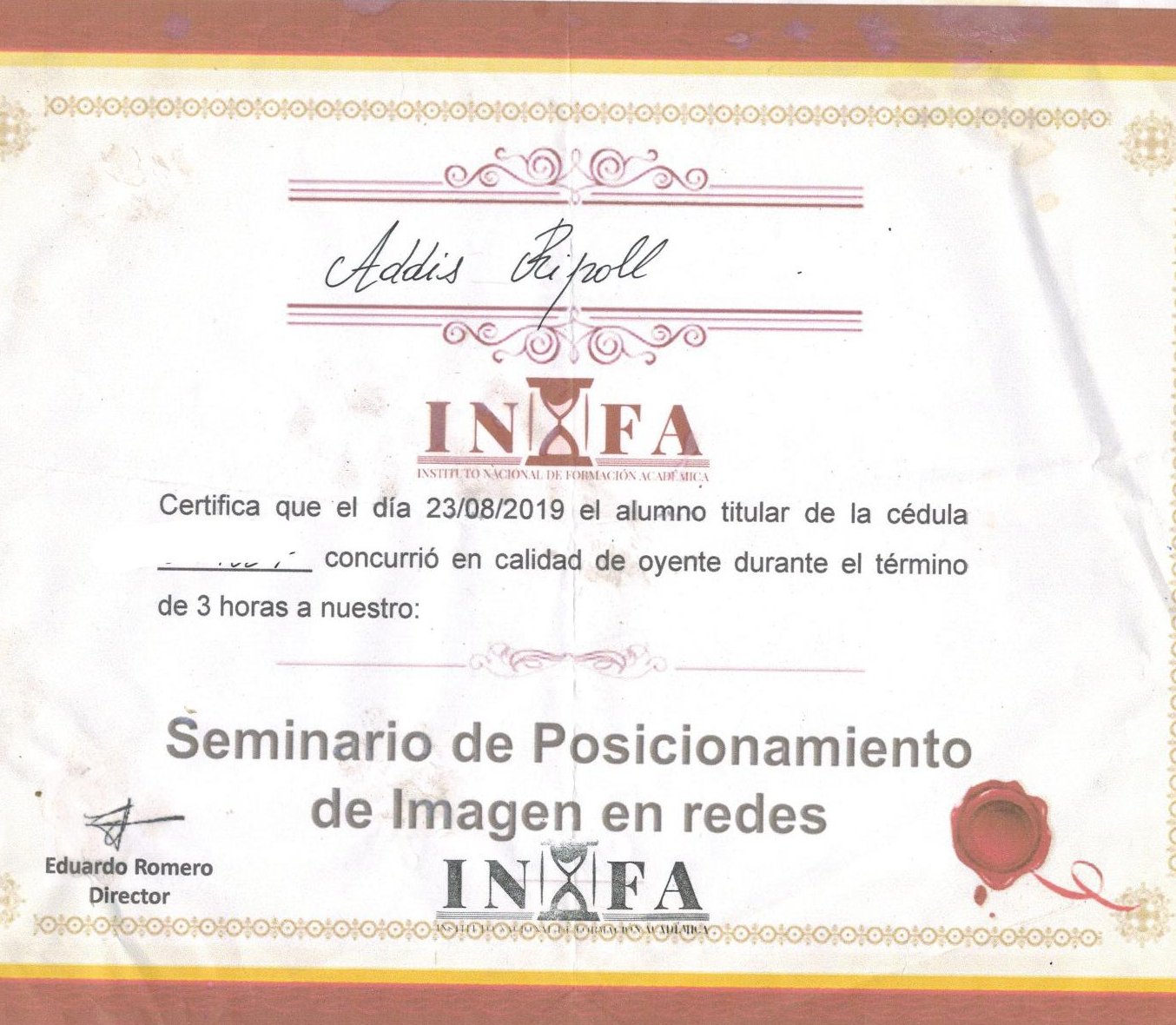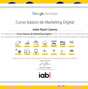 A continuación verás algunas certificaciones recientes en Marketing Digital y afines. Si quieres algo más detallado sobre mis conocimientos y experiencia debes visitar mi perfil en Linkedin: https://www.linkedin.com/in/addisripoll/